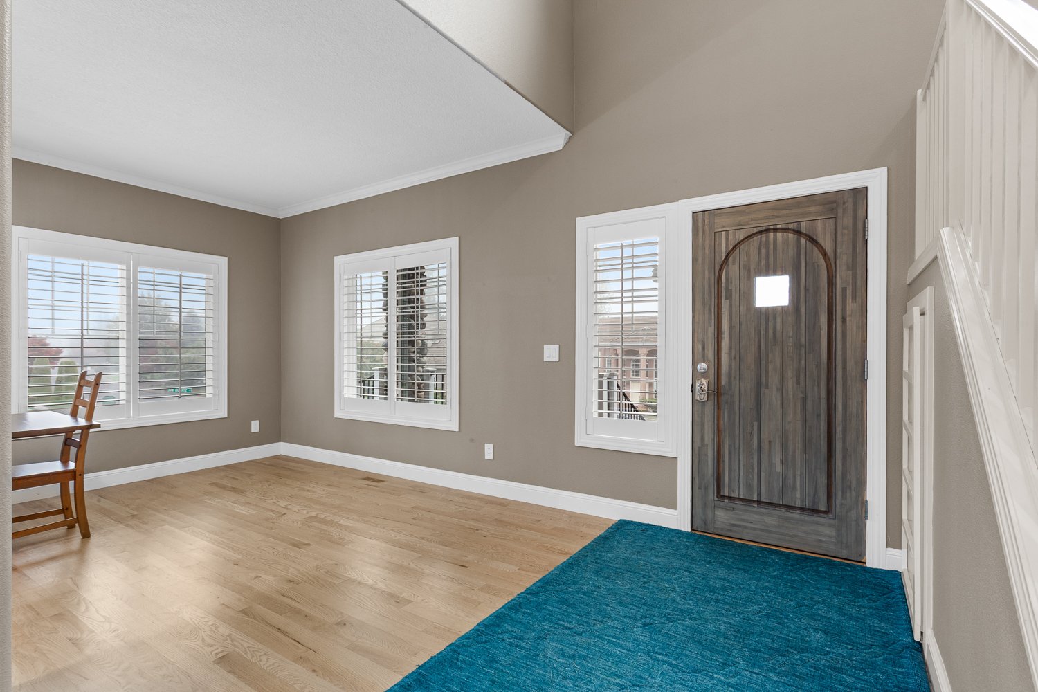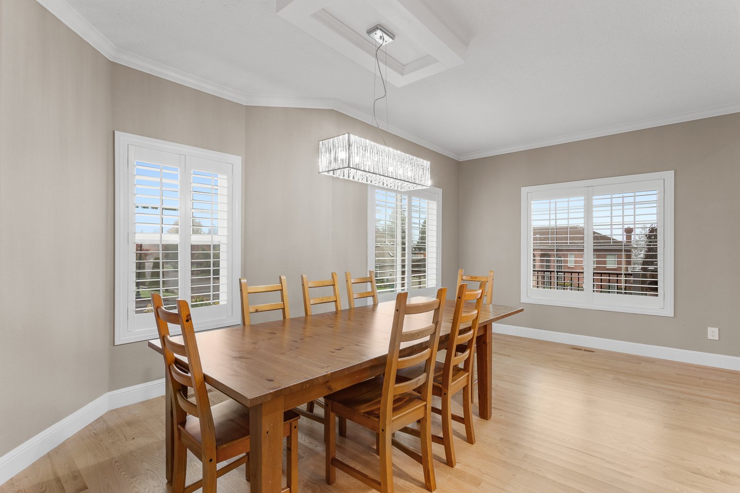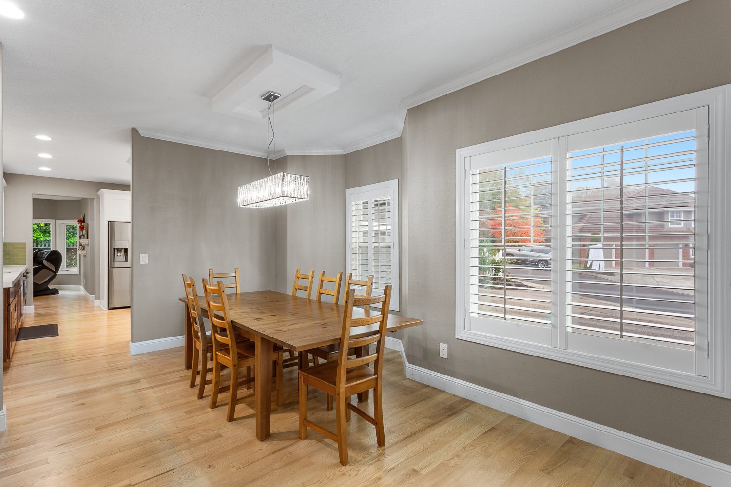 Hardwood floors connect bright living and dining areas with elegant flow.