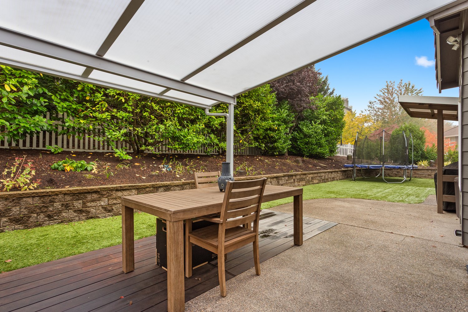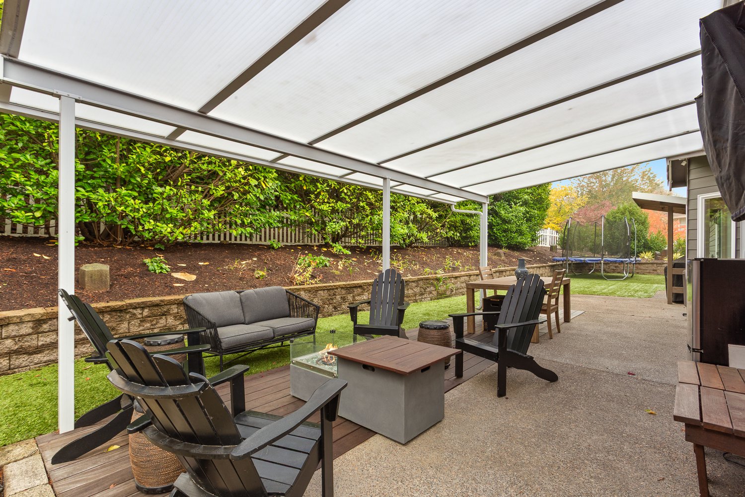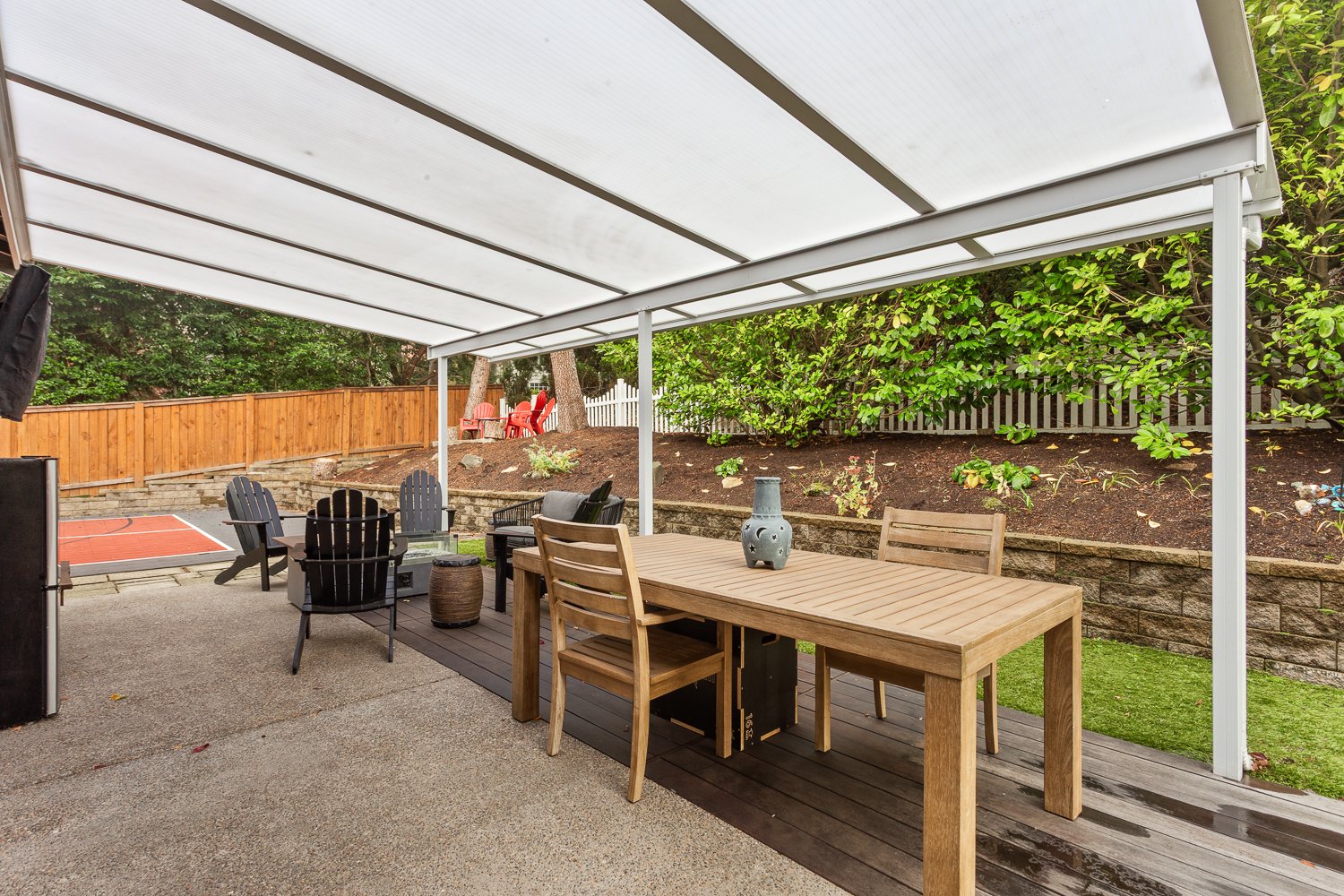 Covered patio overlooks the landscaped yard and sport court for recreation.