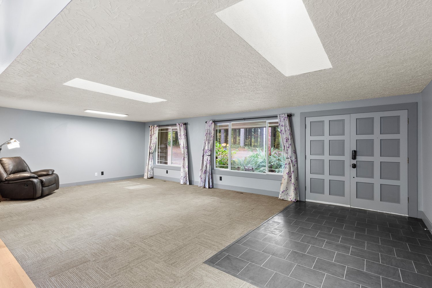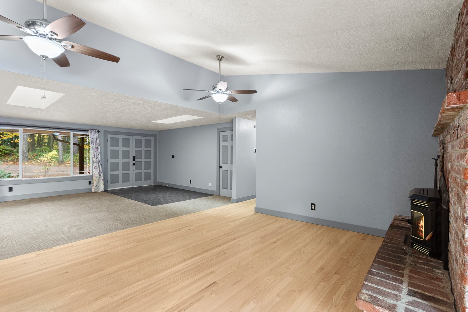 Bright and open with picture windows, skylights, and a cozy pellet stove surrounded by floor-to-ceiling brick.