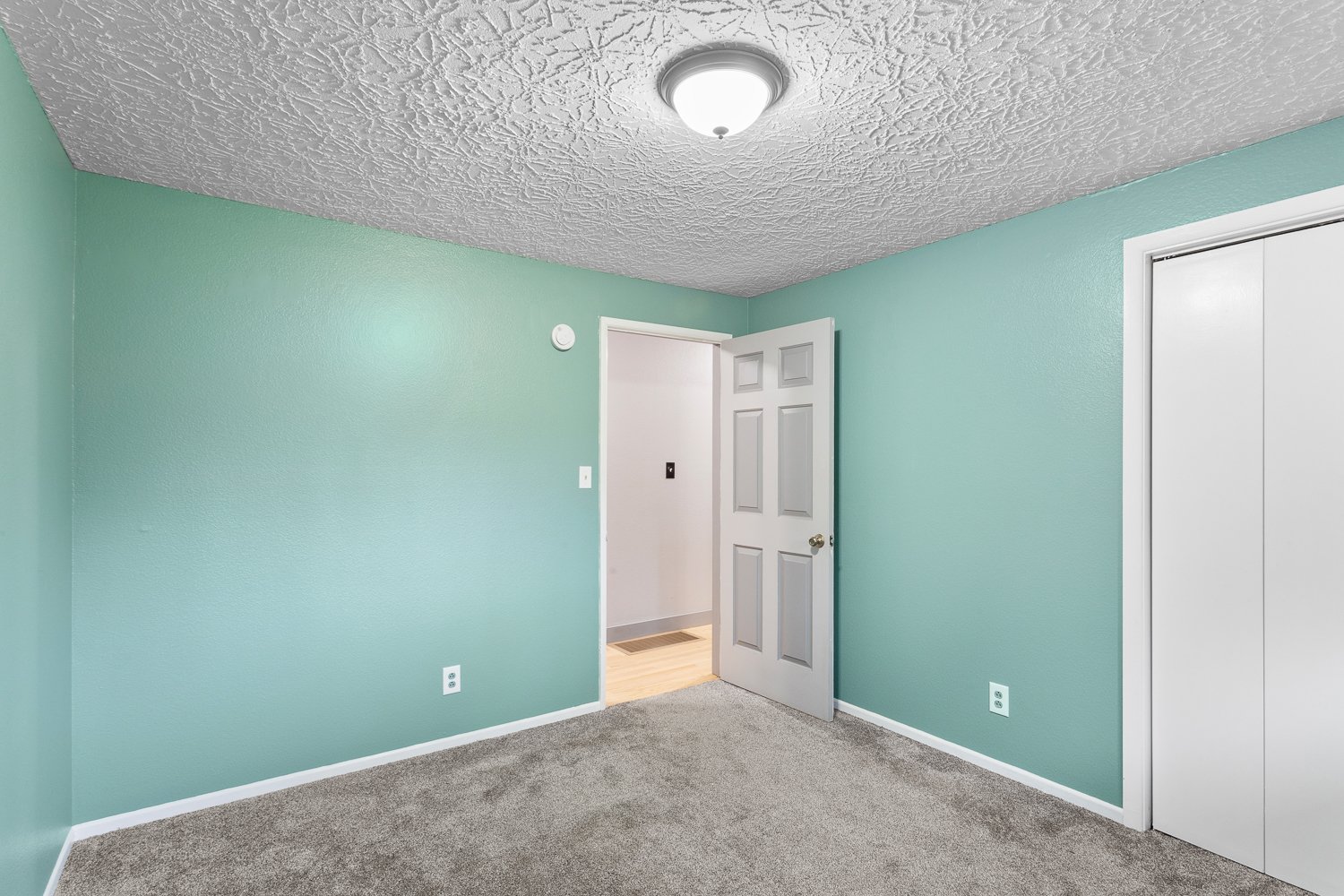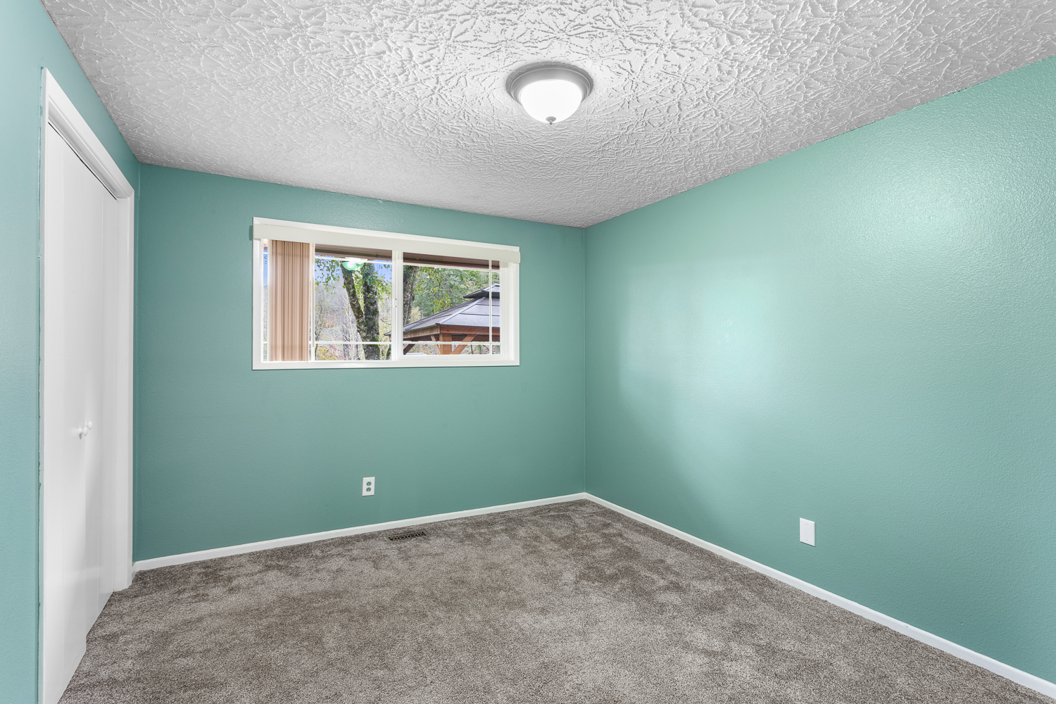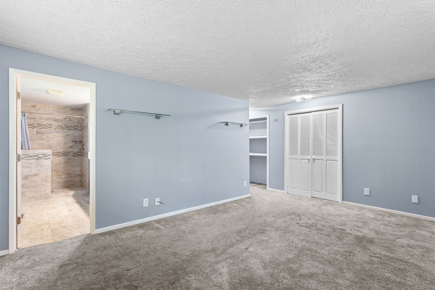 Spacious bedroom with double closets and peaceful views of the wooded surroundings.