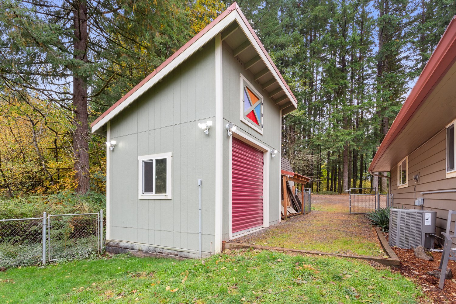 Landscaped seasonal creek, fenced yard area, RV parking, oversized garage, shed, and workshop with power.