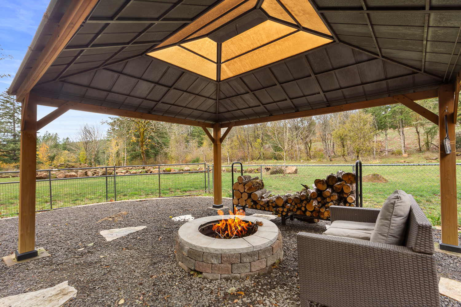 Two gazebos—one with a saltwater hot tub and another with a firepit for year-round enjoyment.